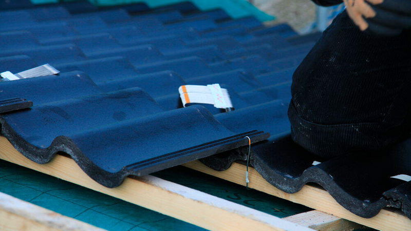 Bei der Dachsanierung einer Flüchtlingsunterkunft am Flughafen Weeze war aufgrund der bestehenden Brettschichtholz-Rahmenträgerbauweise eine Deckung mit geringem Flächengewicht gefordert. Dachdeckermeister Grote verlegte einen Betondachstein mit einem Stückgewicht von 3 kg.