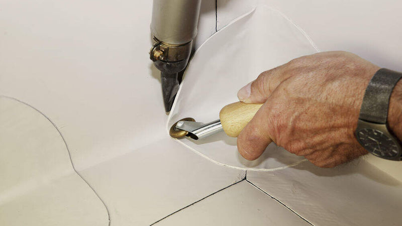 Die Lagesicherung von KunststoffDachbahnen erfolgt zumeist durch mechanische Befestigung am Untergrund oder durch geeignete Auflastsysteme. Unabhängig von der Befestigungsweise müssen Naht- und Anschlussverbindungen regelkonform und nach Vorgaben der Hersteller ausgeführt werden. Wie dies funktioniert, zeigen wir anhand von Bahnen aus flexiblen Polyolefinen (FPO). Wichtig ist, die Nahtstellen je nach Verschmutzungsgrad zu reinigen und vorzubereiten. Um Detailanschlüsse fachgerecht auszuführen, ist unter anderem entsprechendes Werkzeug nötig: ein Handschweißgerät mit 20-Millimeter- Schweißdüse, eine Andrückrolle und ein Messingroller.