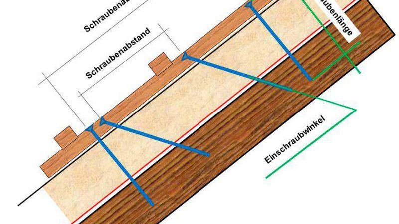 Größte Sorgfalt ist bei der Verschraubung auf eine möglichst mittige Platzierung der Schrauben auf der Konterlatte zu verwenden. Es sind für den vorgesehenen Halt Randabstände auf der Konterlatte einzuhalten. Diese werden entweder in der Berechnung oder auch von unserem Regelwerk gefordert und sind dort angegeben. Auch spezielle Vorgaben in der Berechnung müssen, scheinen sie noch so ungewöhnlich, zum Beispiel vorbohren der Konterlatte, zu sein, gewissenhaft umgesetzt werden. Schrauben, die nicht vollständig im Sparren verschraubt sind (Querschläger) oder neben dem Sparren sitzen sind zu erneuern!