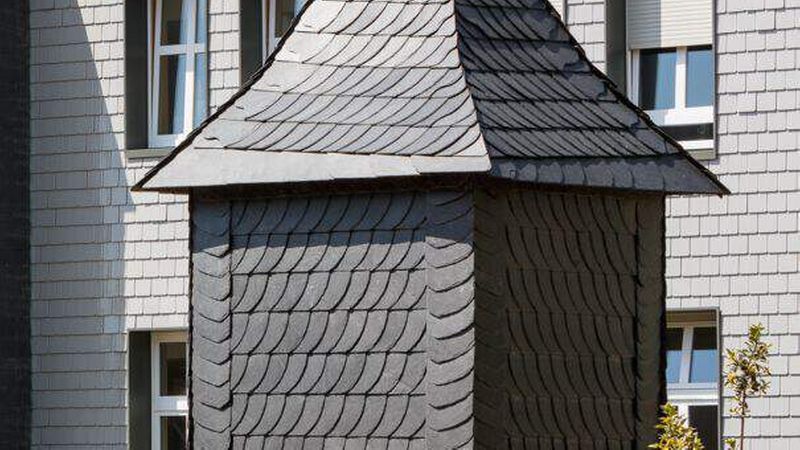 Fassaden-Sanierung Meinerzhagen: Statt WDVS für die Fassade nutzte der Dachdecker eine hinterlüftete Konstruktion bekleidet mit einer besonderen Schieferdeckung.