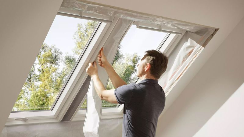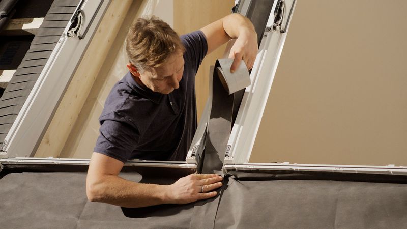 Für die regensichere Abdichtung folgt das Anbringen der Anschlussschürzen. Hier profitiert der Handwerksbetrieb von einer 2024 eingeführten Optimierung für den Einbau von Lichtlösungen. Der zwischen den Dachfenstern liegende Bereich der Anschlussschürzen wird nicht mehr plissiert, sondern glatt zugeliefert. Das bietet eine weitere Erleichterung, da das Glätten der Schürze bei der Verarbeitung im mittleren Bereich entfällt und der Anschluss so wesentlich einfacher ist. Mit dem im Lieferumfang enthaltenen Klebeband lassen sich die übereinandergelegten Schürzen dann ganz einfach und sicher abdichten, sodass auch hier der Schutz vor Kondensat und Flugschnee gewährleistet ist. Zur schnelleren Orientierung ist auf den im Lieferumfang enthaltenen Schürzen jeweils vermerkt, ob sie auf der rechten und oder linken Seite zum Einsatz kommen.