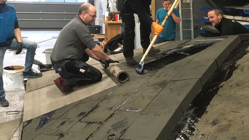 Für die Lagesicherung zeigte sich ein Bitumenkaltkleber als optimales Produkt. Der Kleber ist für die Kaltverklebung von Schaumglasplatten auf Beton und ausgewählten Bitumenbahnen geeignet, bietet sehr gute Standfestigkeit auf gekrümmten Oberflächen und kann in der dreikomponentigen Variante auch bei Dachneigungen ab 45° eingesetzt werden – genau die passenden Eigenschaften für das Projekt. Sowohl die Dämmung als auch die besandete Elastomerbitumenbahn als Trennlage wurden mit dem Kaltkleber gesichert.