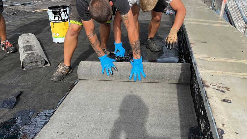 Stattdessen musste sichergestellt werden, dass die Sommerhitze der Verarbeitung des Flüssigkunststoffs keinen Strich durch die Rechnung machte. Denn der Flüssigkunststoff darf bei zu hohen Temperaturen nicht verarbeitet werden. Nach Rücksprache mit Abdichtungshersteller und genehmigt von der Stadt Hamburg, so Michael Schneider, wurden an sehr heißen Tagen die Arbeiten schließlich in die Nachtstunden verlegt und so die Verlegevorschriften eingehalten.